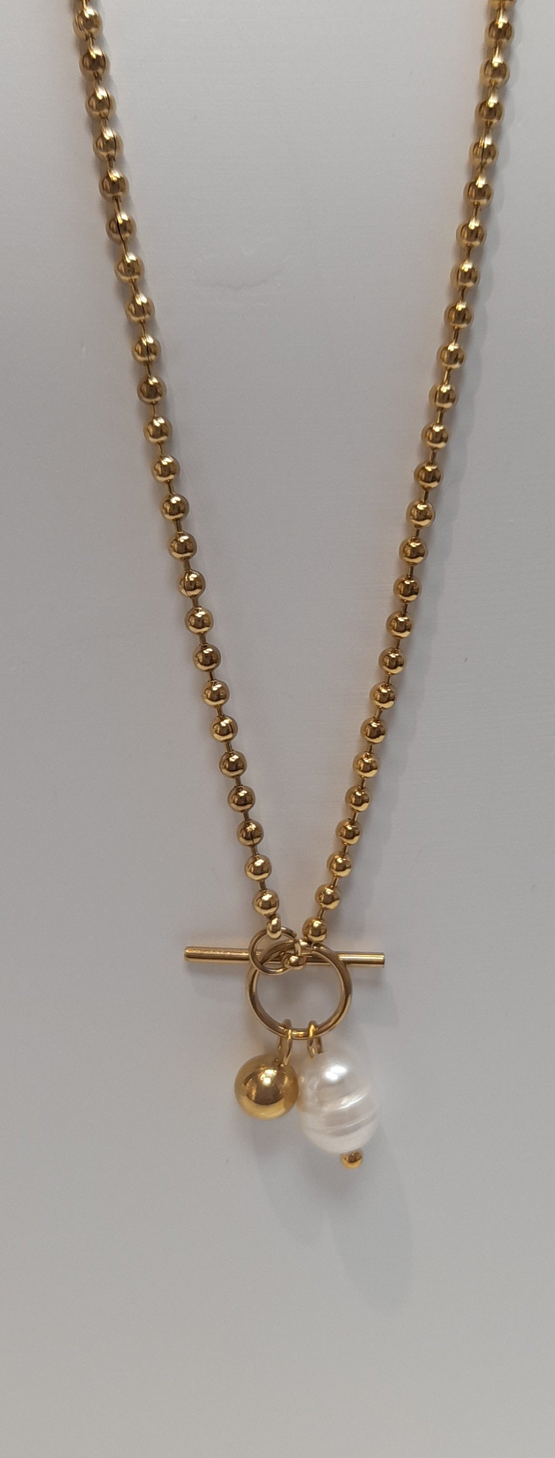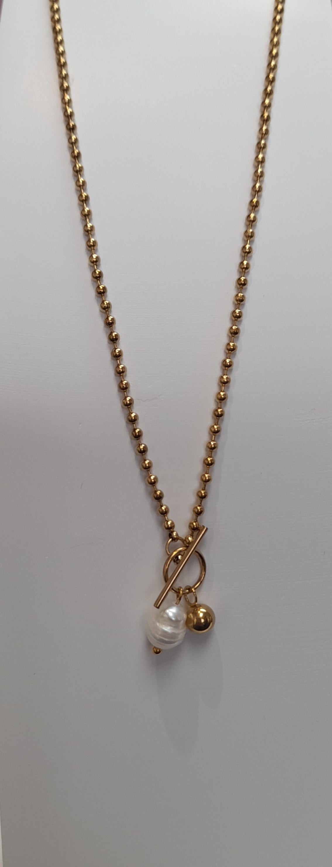 White Leaf Ball Chain Freshwater Pearl T-bar Necklace In Gold